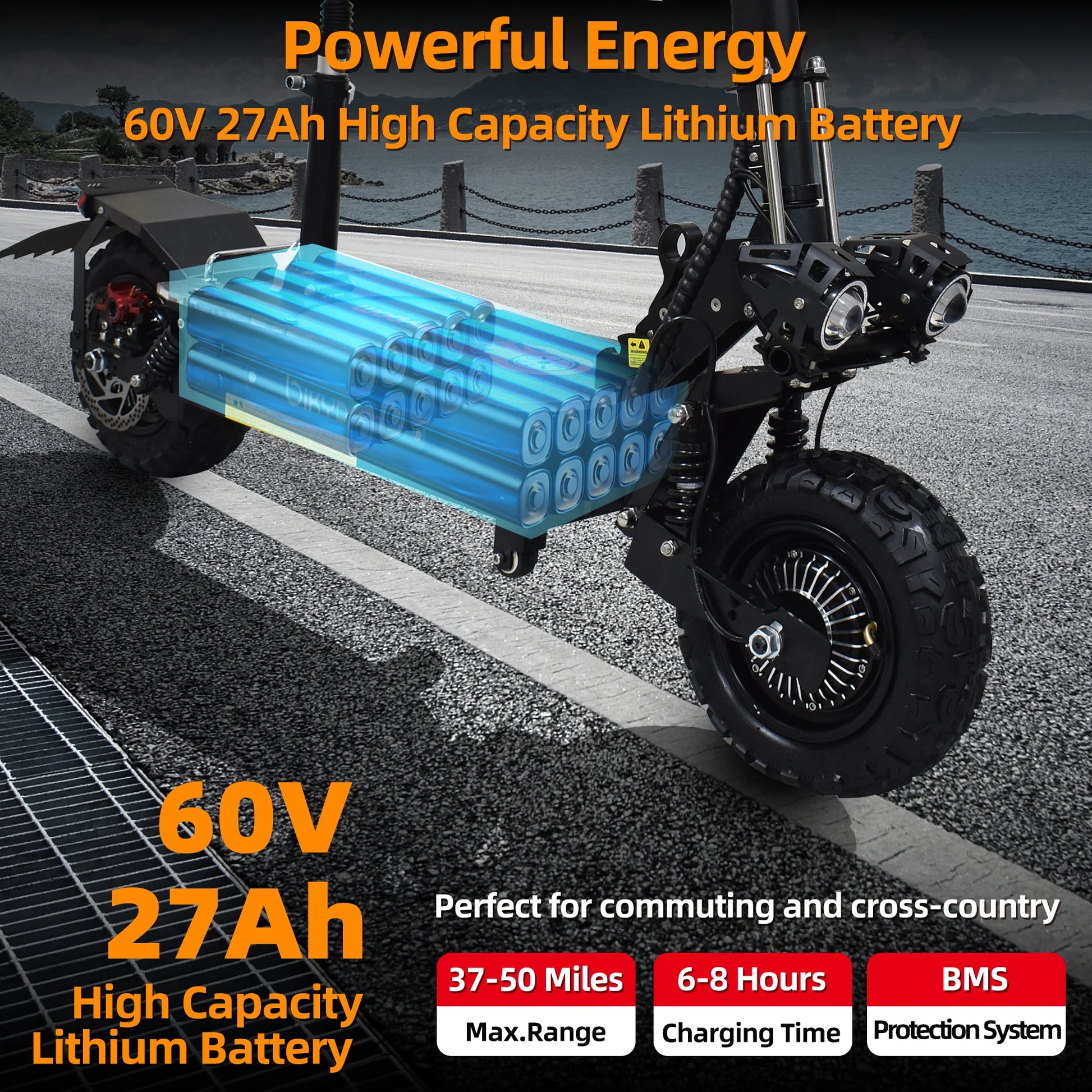 - Tackle long trips with up to 52 miles per charge (60–80 km) on a 60V system powered by a 27Ah battery.